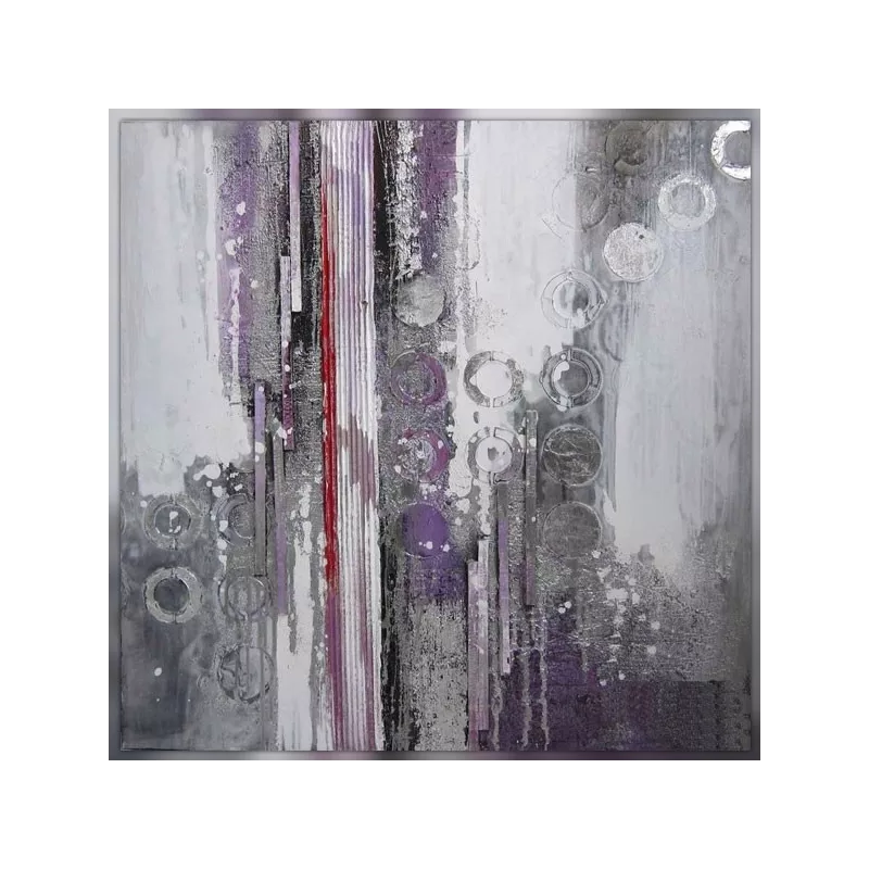 Dette designmaleri bruger relativt kølige, beroligende toner. Kunstneren har valgt at bruge parma, grå og sølv. Resultatet er en ustruktureret, men ikke rodet patina og snavsethed. Strukturen sættes på plads ved hjælp af forskellige elementer, i dette tilfælde en papstrimmel, der er limet sammen med en rødmalet kant, og rytmen sættes af cirkulære, stemplede elementer.