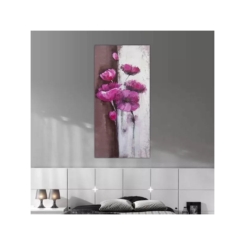 Tidløshed er nøgleordet for blomstermalerier, og det er tilfældet her. Den kontrasterende baggrund deler lærredet i to foroven. Den ene del er brun/chokolade, og den anden er lidt off-white, hvilket giver friskhed og et strejf af sommerindretning til dette lærred. Motivet er udført i mere livlige nuancer, der bryder med helhedens nøgternhed. Denne gang er det en ret lys pink, der næsten tenderer mod lilla.