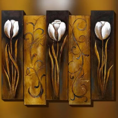 Dette maleri består af 5 paneler, så det har ikke en klassisk udskæring. Resultatet er et indtryk af modernitet, som står i kontrast til et meget mere klassisk motiv: blomster. Tre paneler er dekoreret med hvide knopper, der ligner tulipanblomster, mens to andre har illuminationer.