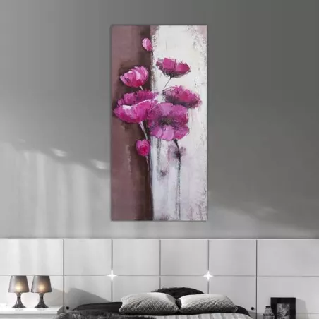 Zeitlosigkeit ist das Schlüsselwort bei Gemälden mit Blumen: Das ist hier der Fall. Wir beobachten einen kontrastreichen Hintergrund, der dieses Gemälde in der Höhe in zwei Teile zerlegt. Ein braun/schokoladenbrauner und ein leicht gebrochener weißer Teil verleihen diesem Gemälde Frische und sommerliche Dekorationsnoten. Das Thema wird mit lebhafteren Farbtönen ausgeführt und bricht die Nüchternheit des Ganzen. Diesmal ist es ein kräftiges Pink, das fast ins Violette geht.