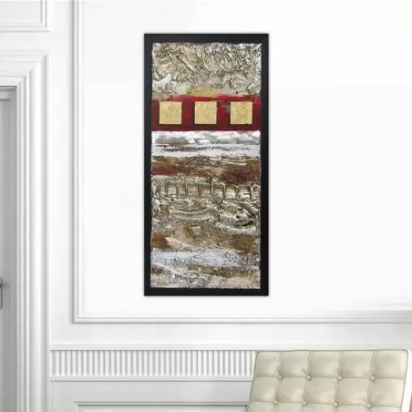 Este cuadro funciona ciertamente en altura. Se puede inspeccionar de arriba abajo y ver cómo el material va tomando forma, organizado en capas. Algunos elementos parecen orgánicos y cobran vida, mientras que otros tienen la apariencia de metal arrugado y estampado. El corte limpio de la banda roja contrasta fuertemente con el resto del fondo dorado. Tres cuadrados dorados están pegados a esta banda. Alineados, aportan serenidad al lienzo y suavizan la composición general.