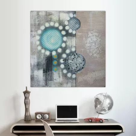 En este lienzo se ha pintado una flor estilizada. Parece estar hecha con estarcido, pero tiene el patrón característico de los elementos serigrafiados. Recuerda a artistas como Roy Lichtenstein, que realizó varios lienzos serigrafiados, y en cierto modo a Warhol, que pintaba retratos serigrafiados en colores vivos: aquí la flor está hecha de cian y amarillo.
