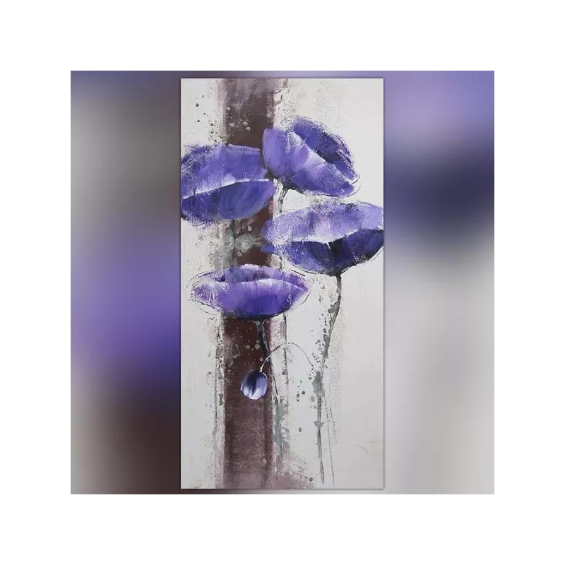 Distinguida por su corola, la flor de este lienzo es una anémona azul. Su tonalidad característica confiere a este cuadro un aire tranquilo y relajante. La composición muy etérea de este cuadro también contribuye a crear una atmósfera zen: las flores parecen haber sido colocadas allí, y descansan como si flotaran.
