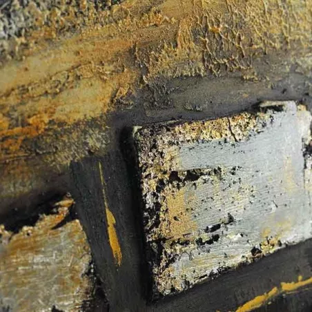 El sombreado y la iluminación ocupan un lugar destacado en este lienzo bastante anacrónico. Hay un revoltijo de diferentes elementos, incluidas iluminaciones y collages, que recuerdan a una pared de piedra seca. Los tonos sepia/caramelo desarrollados en esta composición le confieren un gran encanto.