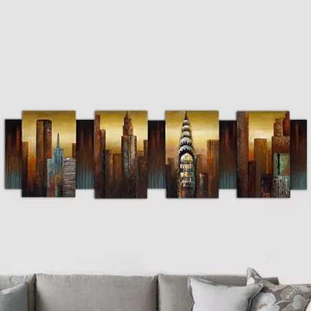 Reprenant le thème en vogue du tableau en relief, cette peinture 3D rassemble des panneaux de bois afin de former une vue urbaine et stylisée de la ville de New York. On observe un arrière plan froid, assez fouillé et très rythmé, qui vient soutenir 4 panneaux de grandes dimensions. Ces panneaux reprennent des éléments architecturaux des buildings de Manhattan. Cette peinture 3D de New York sera parfaite dans un appartement aux beaux volumes, et à l'architecture contemporaine.