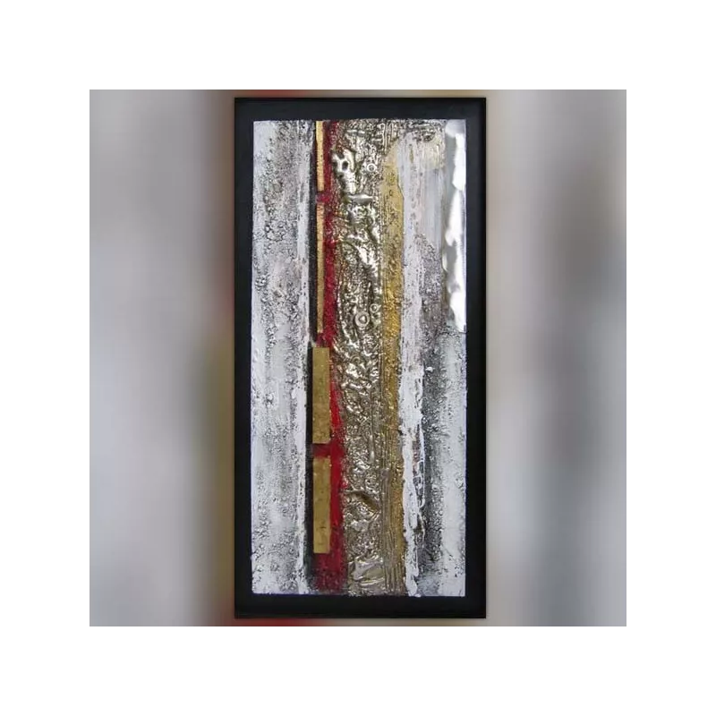 - Les matières : elles sont nombreuses à se côtoyer dans ce tableau. De la feuille d'aluminium brossée à la rondelle d'acier en passant par des éléments en bois peint collés, la matière participe à la richesse de l'ensemble.