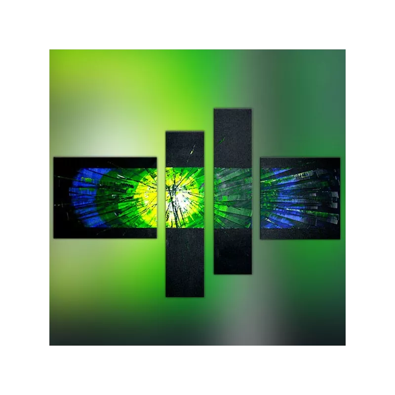 Ce quadriptyque sur fond noir à recours à des éléments asymétriques et un élément focal développant des couleurs bleues, vertes et jaunes.