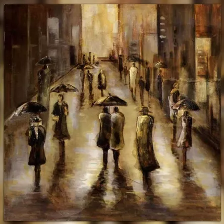 La composition de ce tableau contemporain carré interpelle. On peut y voir une rue dans laquelle marchent des gens par temps de pluie. Cette rue forme un point de fuite, dont la perspective coupe la toile dans son milieu.