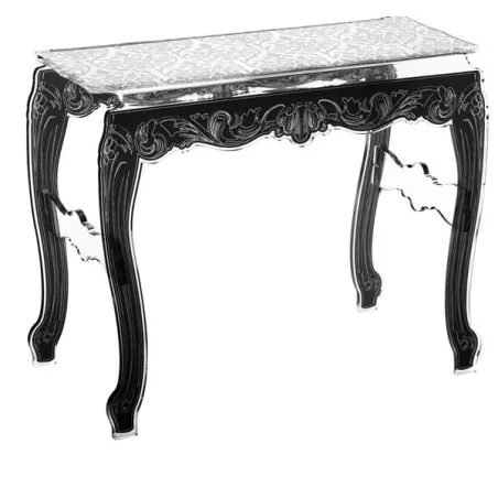 Baroque est une console imaginée en France par les designers de la marque Acrila Concept. Ses lignes inspirées par le mobilier de type Louis XV, sur lesquelles ont retrouve piètement à tête de bélier, feuille d'acanthe et fronton au coquillage, son sublimées par la matière utilisée lors de la fabrication : le plexiglas. La stylisation et l'impression encapsulée à l'intérieur du plexi transparent donnent à l'ensemble un visuel très moderne et contemporain, à réserver aux intérieurs les plus sophistiqués.