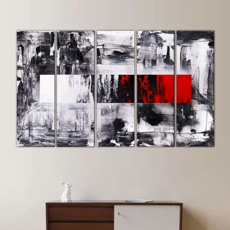 Dieses Polyptychon ist eine sehr grafische Abstraktion. Der schwarz-weiße Hintergrund ist stark strukturiert und vermittelt den Eindruck, dass er fast menschliche Silhouetten enthält. In der Mitte befindet sich ein roter und weißer Farbverlauf, der dem Ganzen einen sehr malerischen Charakter verleiht.