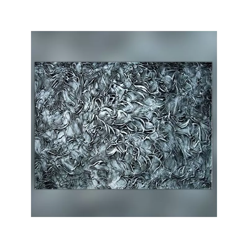 Cette toile abstraite brille grâce à une facture particulière, mettant en valeur le relief. La peinture argentée utilisée ici se voit rehaussée par une patine noire, donnant l'impression de coulures de métal anciennes.