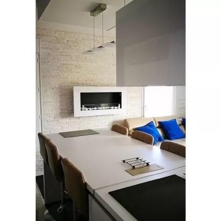 Compatto, con un'altezza di poco più di un metro, questo caminetto presenta un design moderno con linee rette e un frontale in acciaio inossidabile spazzolato in nero opaco o bianco lucido. È dotato di un parafuoco in vetro temperato per una maggiore sicurezza.
