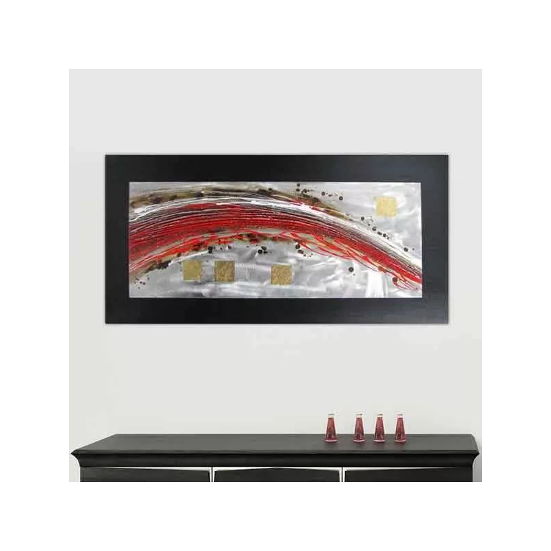 Si tratta di un design molto moderno. Una cornice di tela nera sostiene una lastra di alluminio. Questa lastra è stata lavorata per creare uno sfondo dai riflessi metallici, creando un interessante impatto visivo iniziale. Poi è la volta di un movimento che appare sulla tela: rosso, che si espande da sinistra a destra, questa potente voluta stabilisce il ritmo generale, mentre alcuni elementi quadrati che imitano la foglia d'oro aggiungono un tocco più calmo e rilassante.