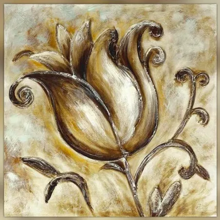Questo quadro sfrutta il formato quadrato per mostrare una rosa: arriva sul bordo destro del dipinto e si sposta verso il lato sinistro, tagliando la tela in un'asimmetria piuttosto anticonvenzionale. Questo taglio dinamico è esaltato dall'uso di colori caldi, che vanno dal marrone al crema e al marrone dorato. Questo quadro, con le sue linee stilizzate, si adatta a qualsiasi arredamento moderno.
