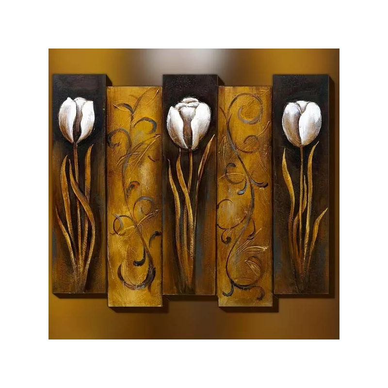 Questo quadro è composto da 5 pannelli, quindi non ha un taglio classico. Il risultato è un'impressione di modernità che contrasta con un soggetto molto più classico: i fiori. Tre pannelli sono decorati con boccioli bianchi che ricordano i fiori di tulipano, mentre altri due presentano illuminazioni.