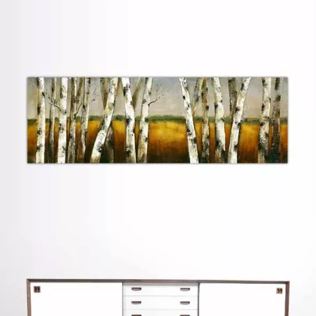 Questa tela panoramica fa un uso eccellente della luce. Raffigura una fila di betulle con corteccia bianca e nera e uno sfondo che mostra una bella gradazione dal nero e oro del grano, al verde del prato, al blu del cielo.