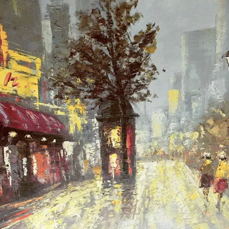 Little Italy, a New York, è stata tratteggiata da molti artisti. Ecco un dipinto contemporaneo di questo vivace quartiere turistico di New York, con i suoi numerosi ristoranti italiani allineati a tutte le ore. Questo quadro non è estraneo al naturalismo tanto caro a Edward Hopper e ritrae la vita all'interno della Grande Mela. In lontananza si vede un edificio dalla silhouette famosa, nientemeno che l'Empire State Building.