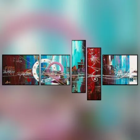 Questa composizione dinamica incorpora il colore, in particolare il rosso e l'azzurro. È composta da 5 pannelli asimmetrici, che creano continuità nel disegno: forme rotonde e linee curve si ritrovano ovunque, dando forza visiva all'insieme.
