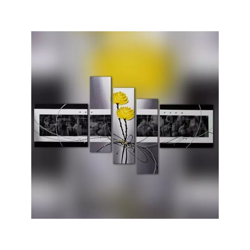 Questo polittico crea un contrasto grazie a uno sfondo piuttosto neutro - nero, grigio e bianco - abbinato a un soggetto floreale molto colorato. Come un nodo che lega le zampe dei fiori, sottili nastri corrono per tutta la lunghezza della tela, convergendo al centro.