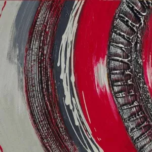 Dit abstracte doek, gemaakt op basis van een collage van aluminiumfolie, roteert in wezen dankzij twee hoofdrichtingen:
