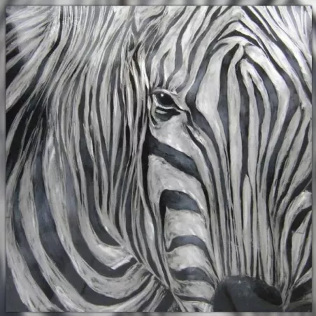 Je kunt je dit eigentijdse schilderij voorstellen in een flat met pop tinten: in feite werden de zebra en zijn huid in de jaren 70 in vele vormen gebruikt in decoratie. Je kunt je dit schilderij ook voorstellen in een grafisch ensemble, een kamer waar de overheersende kleuren zwart en wit zijn. Het is ook mogelijk om een oude decoratieve stijl, de zebrajachttrofee, af te stoffen.