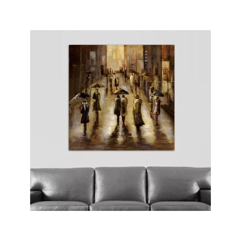 De compositie van dit vierkante eigentijdse schilderij is opvallend. Het toont een straat waar mensen in de regen lopen. De straat vormt een verdwijnpunt, waarbij het perspectief het midden van het doek doorsnijdt.