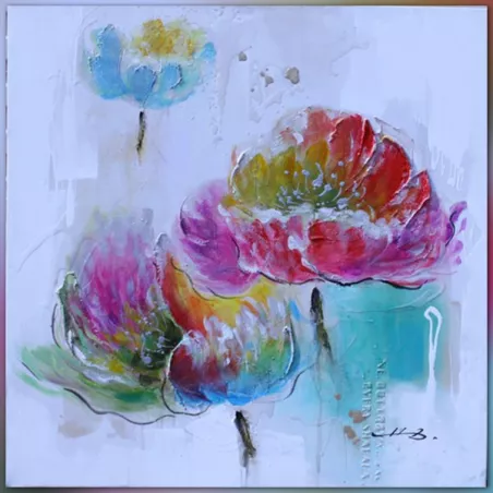 Tegen een witte achtergrond heeft dit vierkante schilderij het thema bloemen. Ze zijn geschilderd in tinten en texturen die doen denken aan aquarel- en pasteltinten. Talrijke kleuren geven het schilderij een opvallend effect.