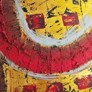 - Färgerna: Röd, guld och några inslag av vitt är närvarande i denna målning. De skapar en grafisk bild som påminner om tonerna i traditionella kinesiska sidenkostymer.