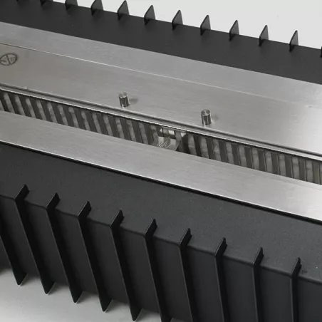 Denna fristående eldstad är anmärkningsvärd eftersom den är nomadisk och inte har några krusiduller. Den består av ett strömlinjeformat block med omgivande lameller som ger bra stöd och stabilitet åt modellen.
